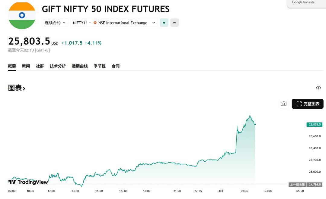 受消息影响,印度基准股指Nifty 50的股指期货一度飙升;在美国上市的iShares MSCI India ETF涨近3%。离岸市场中,印度卢比对美元走强,上涨1%。