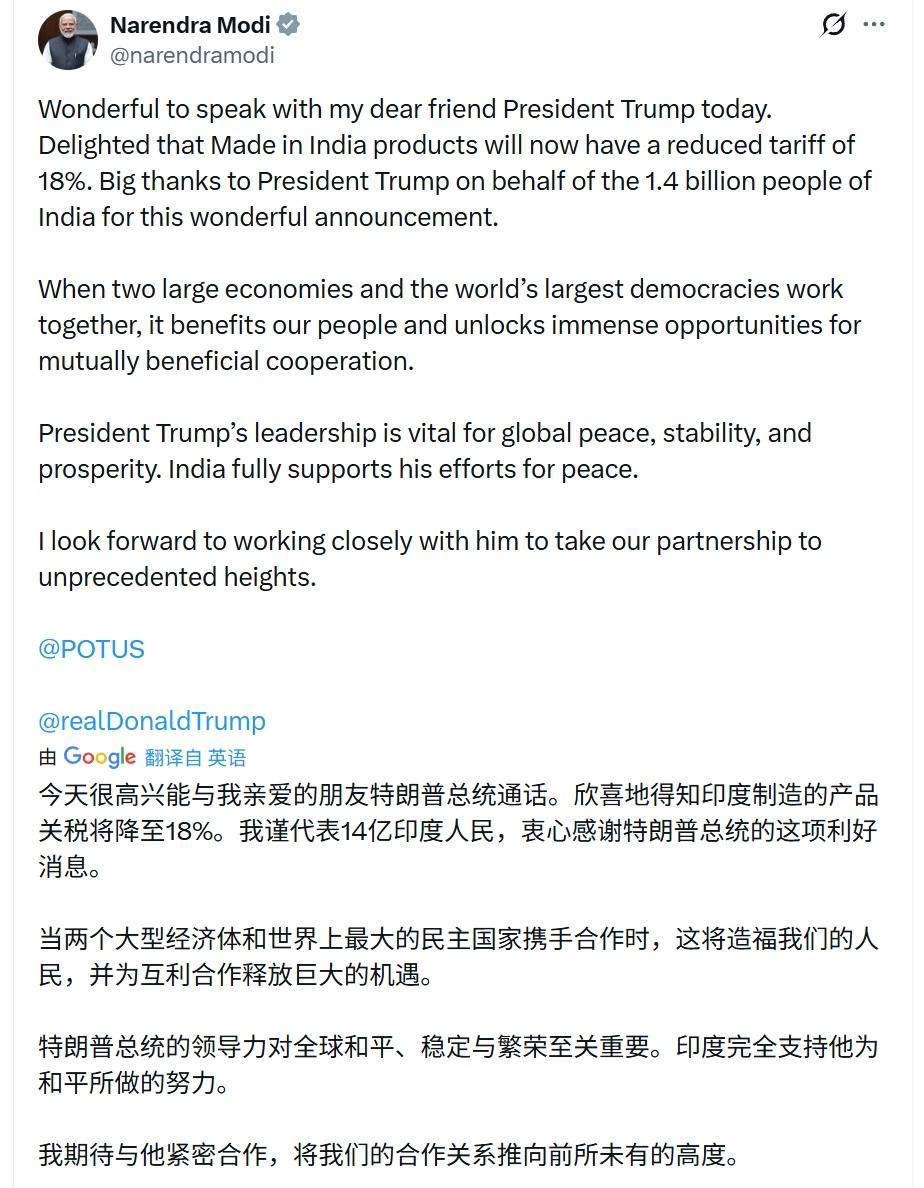 莫迪也在社交媒体发文确认该协议,称“‘印度制造’产品的关税现已下调至18%”。