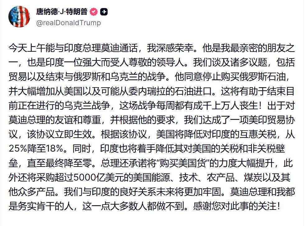 特朗普在社交媒体上写道:“出于对莫迪总理的友谊与尊重,并应他的请求,我们立即同意美国与印度达成贸易协议。我们与印度令人惊叹的关系,未来将更加强大。”