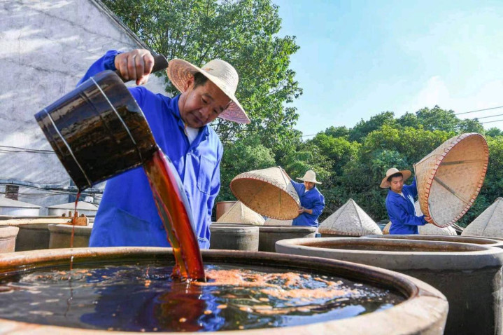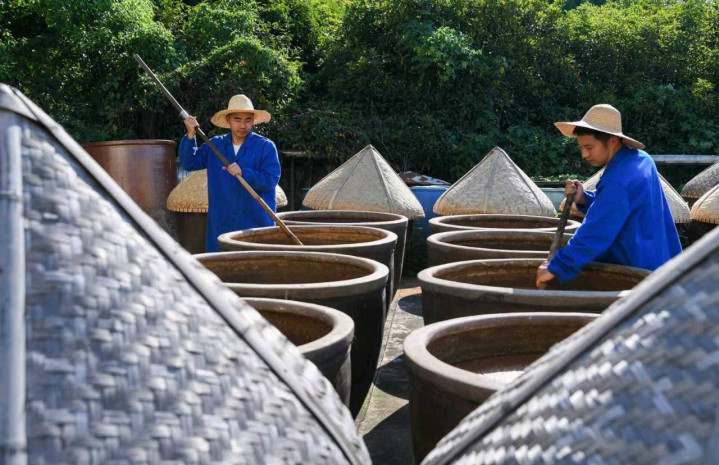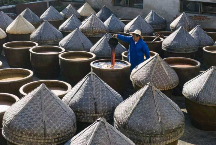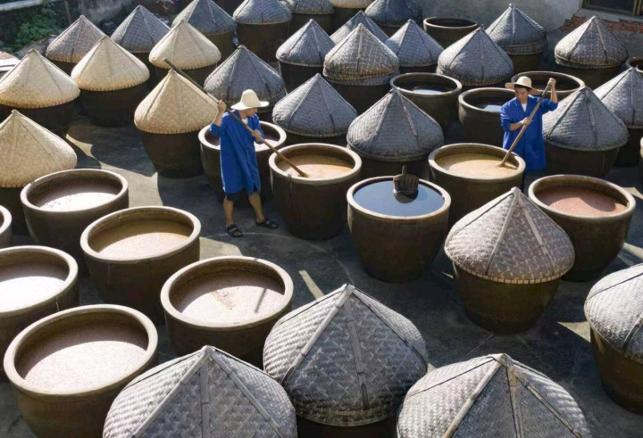 初秋时节,连续的晴热天气正适合酿晒酱油,酿造师傅把煮熟黄豆拌入小麦粉的酱料放进大缸,通过阳光高温作用,让微生物把蛋白质分解转化为氨基酸。采用传统酿造工艺制成的酱油,有着“色泽红润、酱香浓郁、味道醇鲜”的特点,受到消费者青睐。
