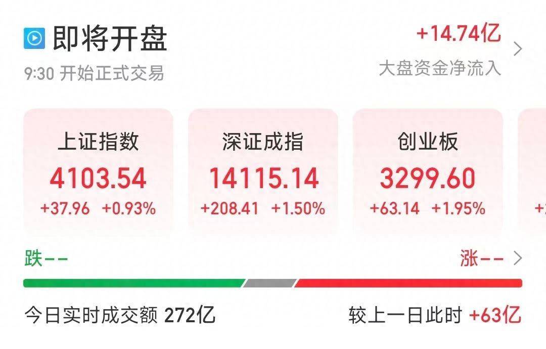 【大河财立方消息】2月9日,A股三大指数集体高开,沪指涨0.93%,站上4100点在配资炒股,深证成指涨1.50%,创业板指涨1.95%。短剧游戏、Kimi、中文语料库、虚拟人、太空光伏等热门概念股涨幅居前,沪深北三市超4800只个股上涨。