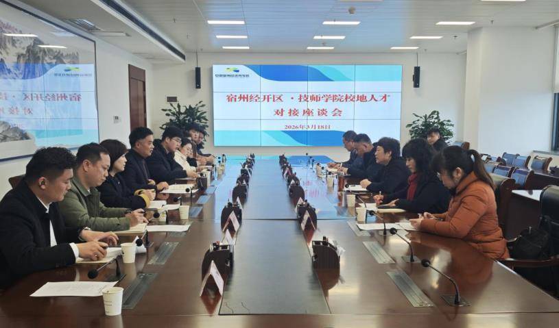 实地参观结束后,宿州经开区党工委副书记李沂主持召开校地人才对接座谈会。会上,政校企三方围绕订单式培养、共建实习实训基地、学生顶岗实习、毕业生就业输送等关键事项进行深入交流,提出了具体可行的合作建议。宿州经开区人力资源服务中心、经济与科技局、营商环境局、招商中心等相关部门负责人参加座谈。